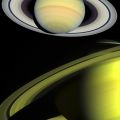 | | NASA, ESA, E. Karkoschka, JPL | | Fast zeitgleiche Aufnahme des Planeten Saturn. Oben: Aufnahme vom Hubble Space Telescope, Unten: Von Cassini eingefangenes Bild |
