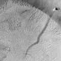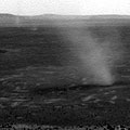 | Windhose auf der Marsoberfläche - Der frische Pfad ist recht deutlich erkennbar, der eigentliche Wirbel befindet sich oben rechts am Ende der Spur. |