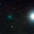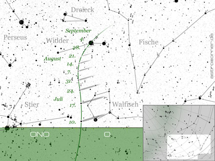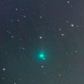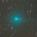 | Komet Boattini am 24. Juli 2008 (links) und 7. August 2008 (Mitte) mit grüner Koma und bläulichem Ionenschweif. Das rechte Bild zeigt den nur noch 9-10 mag hellen Kometen am 31. August bei seiner Passage des etwa 2 mag hellen Haupsterns im Sternbild Widder Hamal (Alpha Arietis). Obwohl die Helligkeit des Kometen zu dieser Zeit schon deutlich zurückgegangen war, konnte noch immer ein schwacher langer Ionenschweif beobachtet werden. |