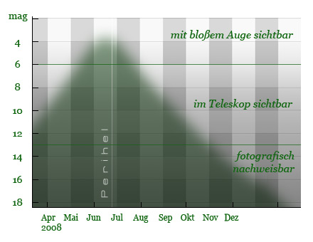 In der ersten Jahreshälfte konnte der Komet vorerst am Nachthimmel, später nur noch über dem abendlichen SW-Horizont im Sternbild Wasserschlange beobachtet werden. Seinem sonnennächsten Bahnpunkt entgegen strebend erreichte er im Mai 2008 bereits eine Helligkeit, die ihn in Ferngläsern und unter besonders günstigen Bedingungen sogar mit dem bloßen Auge sichtbar werden ließ. Doch schon Ende Mai kam er der Sonne so nahe, dass er von der nördlichen Hemisphäre aus nicht mehr erkannt werden konnte.