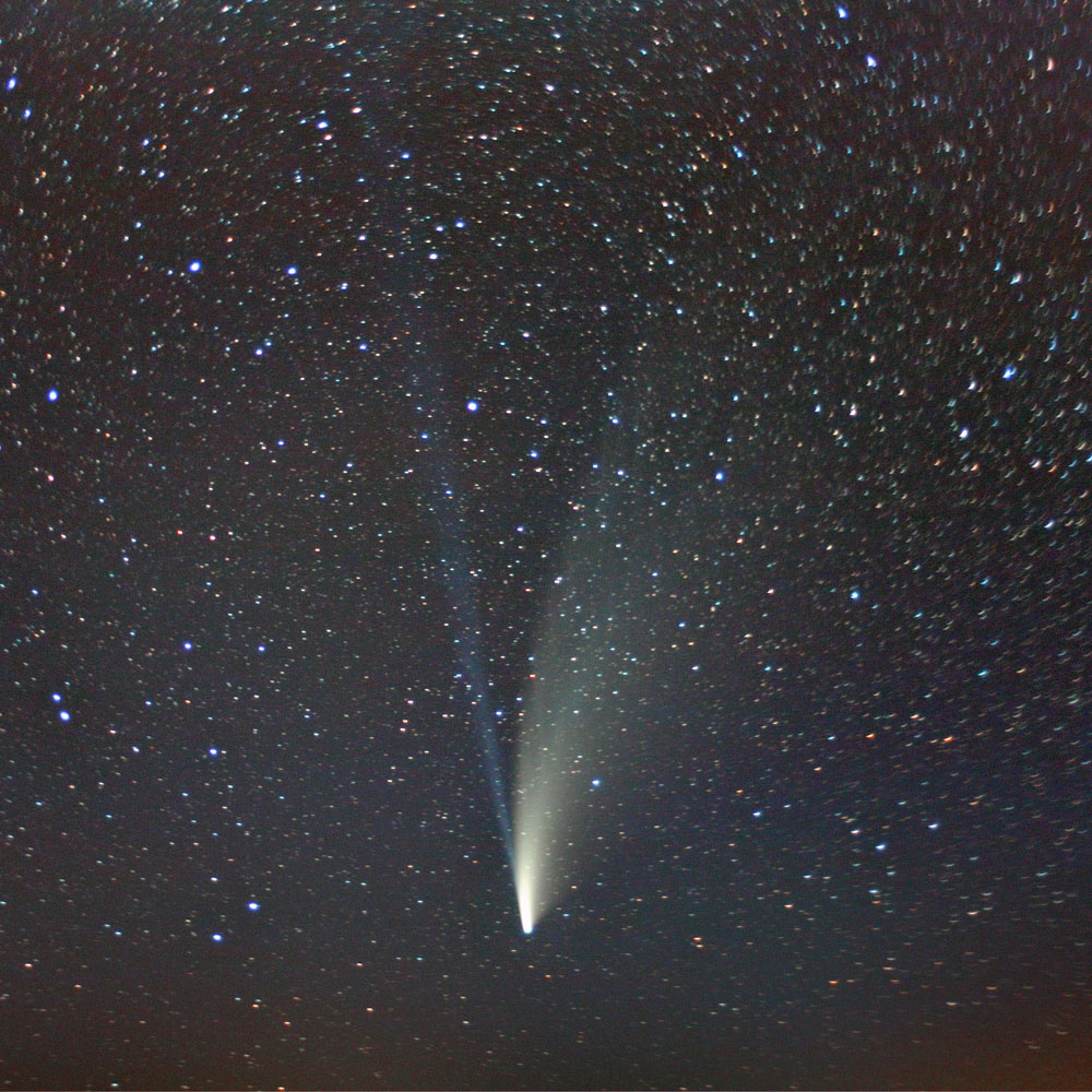 Während die Welt den ersten Sommer in der Corona-Pandemie erlebte, erschien ein außergewöhnlich heller Komet am Sommerhimmel, der aufgrund seines Erscheinungsbilds und seiner Bahn am Himmel ein wenig an den Jahrhundertkometen »Hale−Bopp erinnern ließ, der 1997 zu beobachten war. NEOWISE erreichte zwar nicht dessen Helligkeit, entwickelte aber einen recht imposanten Staubscheif, der selbst in Innenstädten mit dem bloßen Auge erkannt werden konnte. Auf fotografischen Aufnahmen zeigte sich zudem ein sehr langer bläulicher Gasschweif.