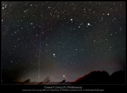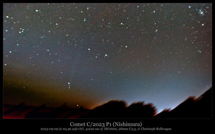 C/2023 P1 (Nishimura) ist ein hyperbolischer Komet, der erst am 12. August 2023 von dem Japaner Hideo Nishimura auf Fotos entdeckt wurde, die er mit einer digitalen Spiegelreflexkamera Canon EOS 6D angefertigt hatte. Zu dieser Zeit befand sich der Komet im Sternbild Zwillinge, war 10,5 mag hell und zeigte eine Koma von etwa 5 Bogenminuten Durchmesser.