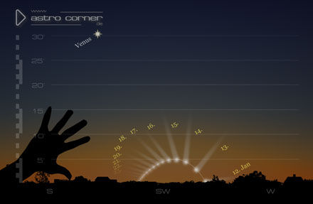 | Positionen des Kometen C/2024 G3 (ATLAS) im Januar 2025 am Abendhimmel bei Sonnenuntergang (gegen 17 Uhr MEZ) wenige Grad über dem Horizont. |