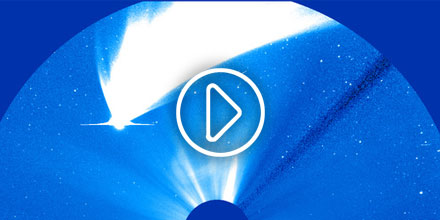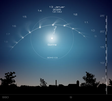 | Bahn des Kometen C/2024 G3 (ATLAS) Mitte Januar 2025 am Tageshimmel. Die angegebenen Positionen beziehen sich auf 12 Uhr MEZ des jeweiligen Tages. Der die Sonne umspannende Kreis markiert das Bildfeld der Kamera C3 an Bord des Sonnenobservatoriums SOHO. ATLAS war hier vom 11. bis zum 15. Januar 2025 zu erkennen. Im Perihel befand er sich nur etwa 4 Grad nördlich der Sonnenscheibe. |