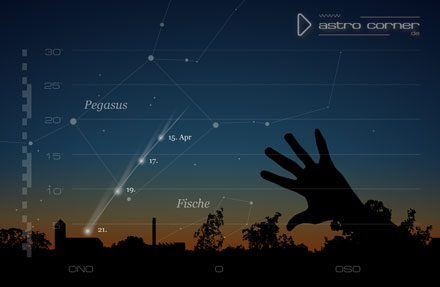 Das folgende Bild zeigt die aktuelle Aufnahme des weltraumgebundenen Sonnenobservatoriums SOHO. Komet PanSTARRS wird im Bildfeld des Koronographen C3 vom 23. bis 26. April 2026 zu erkennen sein.