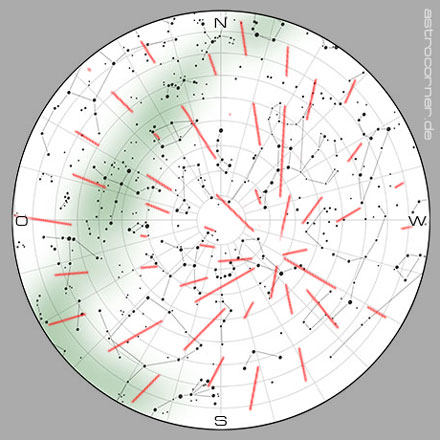 Die Meteore eines Stromes scheinen alle von ein und dem selben Punkt am Himmel zu kommen - der sogenannte Ausstrahlungspunkt bzw. Radiant.