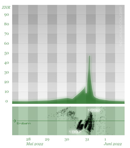 Tatsächlich kam es zu einem zwar recht verhaltenen, im Vergleich zu anderen Jahren aber ungewöhnlich starken Ausbruch. Himmelsgucker in Mitteleuropa konnten in den wenigen dunklen Stunden zwischen etwa 23 und 3 Uhr in der Nacht vom 30. auf den 31. Mai 2022 vereinzelte Meteore erkennen.
