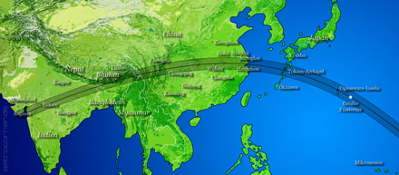 Verlauf der Kernschattenzone der totalen Sonnenfinsternis vom 22. Juli 2009 in Indien
