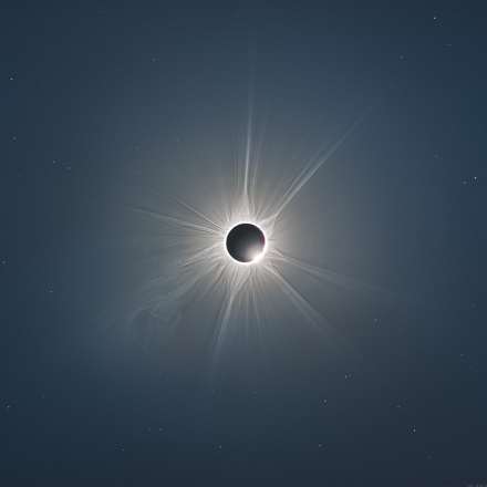 HDR-Aufnahme der Maximums-Korona während der Sonnenfinsternis vom 20. April 2023 - unten links ist ein koronaler Massenauswurf zu erkennen, der sich von der Sonne weg bewegt