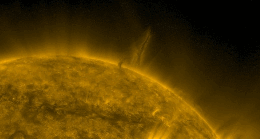 Auch auf den Aufnahmen des weltraumgebundenen Solar Dynamics Observatory (SDO) ist die große Protuberanz zu erkennen, die in den Stunden nach der Finsternis eine starke Dynamik entwickelte.
