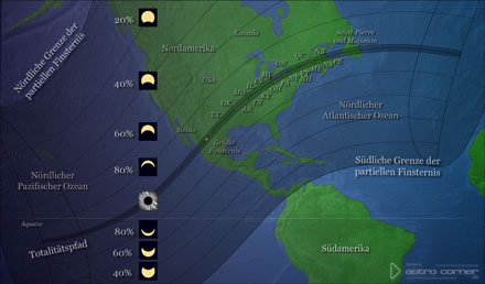 pazifischen Ozean. Der Kernschatten des Mondes erreichte erst zur Mittagszeit (Lokalzeit) bzw. um 20.09 Uhr Mitteleuropäischer Sommerzeit (MESZ) die Westküste Nordamerikas.