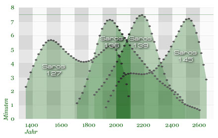 Durango ein. Daraufhin zog der 198 Kilometer breite Kernschatten mit einer Geschwindigkeit von 700 Metern pro Sekunde weiter in nordöstliche Richtung über