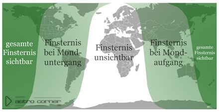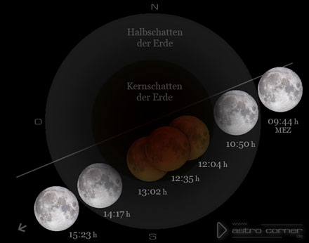 Am 3. März 2026 ereignet sich eine in Europa nicht beobachtbare totale Mondfinsternis. Um 12:35 h Mitteleuropäischer Zeit (MEZ) wird die größte Finsternis erreicht - wenn der Mond in Mitteleuropa unter der Horizontlinie steht.