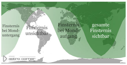 Auf seiner scheinbaren Bahn am Himmel bewegt sich unser Trabant während der totalen Phase durch nördliche Bereiche des Kernschattens. Zur Finsternismitte um 17:53 h befindet sich die südliche Hemisphäre des Mondes nahe des Kernschattenzentrums. Es sollte daher eine Zunahme der Oberflächenhelligkeit zum nördlichen Bereich der Mondscheibe hin zu beobachten sein.