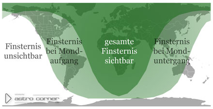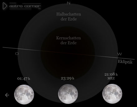Um 23:29 h wird die größte Finsternis erreicht - der Mond wird zu dieser Zeit mit etwa 94,16% seines Durchmessers maximal in den Halbschatten der Erde eingetaucht sein. Er steht dann je nach Beobachtungsort ungefähr 60 Grad über dem SSO-Horizont. Unser kosmischer Begleiter benötigt insgesamt 4 Stunden und 39 Minuten, um den Halbschatten der Erde vollständig zu durchqueren.