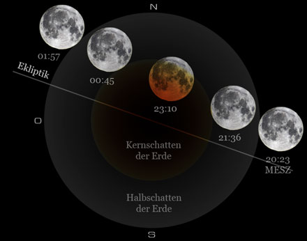 Zur Finsternismitte um 23:10 Uhr befand sich der nördliche Rand des Mondes noch außerhalb des Kernschattens und erschien somit hell beleuchtet. Allerdings war der Mond bis dahin mit immerhin 81% seines scheinbaren Durchmessers in den Kernschatten eingedrungen.