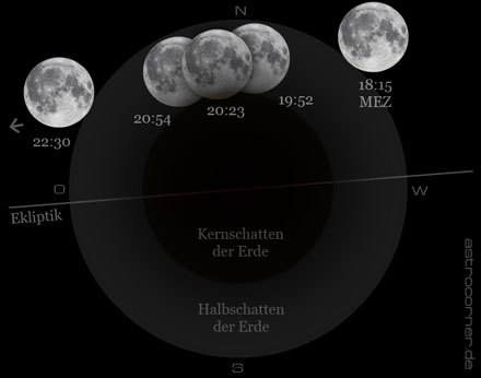 Der Vollmond trat um 18:15h MEZ in den Halbschatten der Erde ein. Zu dieser Zeit stand er etwa 15 Grad hoch über dem Ostnordost-Horizont. Im Laufe der nächsten eineinhalb Stunden war zu erkennen, wie sich ein leichter dunkler Schleier aus südöstlicher Richtung über den Mondglobus zog.