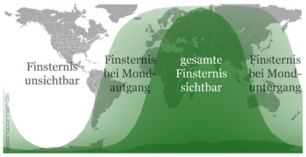 Für die meisten Beobachter in Mitteleuropa begann die Finsternis erst mit dem Aufgang des bereits verfinsterten Mondes um etwa 20:15h (abhängig vom Beobachtungsort) am Abendhimmel. Zur gleichen Zeit ging die Sonne am gegenüberliegenden Horizont unter.