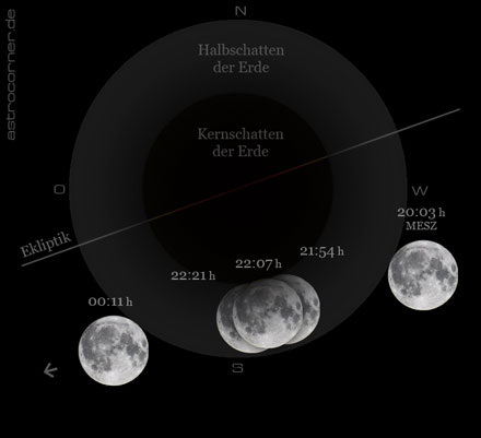 Bei dieser partiellen Mondfinsternis trat der Erdtrabant nur zu einem sehr geringen Teil in den dunklen Kernschatten der Erde ein, so dass ein Großteil der Mondoberfläche weiterhin hell erstrahlte. Die fast bedeutungslose Kernschattenphase dauerte nur von 21:54h bis 22:21h an.
