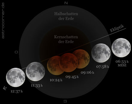 Pfad des Mondes durch den Schatten der Erde während der totalen Mondfinsternis vom 15. April 2014 - alle Zeitangaben in MESZ