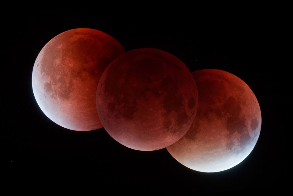 Der Mond drang immer tiefer in den Kernschatten der Erde ein, bis er darin um 04:11h vollständig eingetaucht war. Der total verfinsterte Himmelskörper erschien dann allerdings nicht vollständig dunkel - ähnlich wie bei einem Sonnenuntergang brechen sich in der Erdatmosphäre vorwiegend rote Sonnenstrahlen, die den Mond erreichen und seine Oberfläche in Farbnuancen von fahlem Kupferrot bis zu strahlendem Orange tauchen.