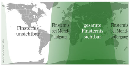 Für die meisten Beobachter in Mitteleuropa begann die Finsternis erst mit dem Aufgang des bereits verfinsterten Mondes um etwa 19:30h (abhängig vom Beobachtungsort) am Abendhimmel. Zur gleichen Zeit ging die Sonne am gegenüberliegenden Horizont unter.