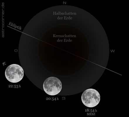 Diese Finsternis konnte im deutschsprachigen Raum fast in ihrer vollen Länge beobachtet werden. Der Mond ging auf, kurz nachdem er in den Halbschatten der Erde eintrat.