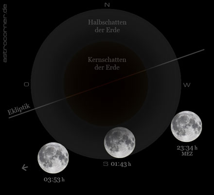 Um 01:43h war die größte Finsternis erreicht - der Mond war zu dieser Zeit mit etwa 98,8% seines Durchmessers maximal in den Halbschatten der Erde eingetaucht. Der Mond stand zu dieser Zeit je nach Beobachtungsort etwa 50 Grad über dem SSW-Horizont. Unser kosmischer Begleiter benötigte insgesamt 4 Stunden und 19 Minuten, um den Halbschatten der Erde vollständig zu durchqueren.