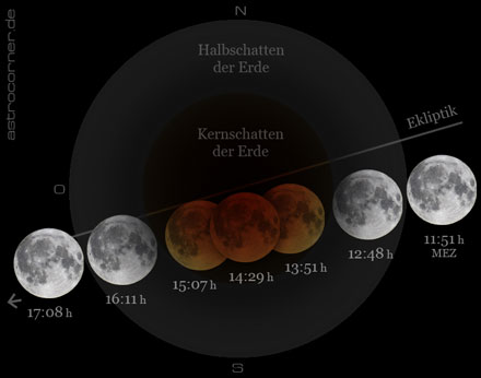 Pfad des Mondes durch den Schatten der Erde während der totalen Mondfinsternis vom 31. Januar 2018 - alle Zeitangaben in MEZ