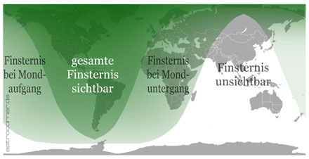 Der Himmelskörper befand sich zu dieser Zeit noch mehr als 30 Grad über dem westlichen Horizont. Während der darauffolgenden Stunden nahm die Höhe des Mondes nach und nach ab und betrug zum Ende der Kernschattenphase weniger als 5 Grad.