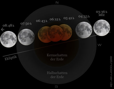 Der bedeutsame Teil dieser Finsternis begann mit dem Eintauchen des Mondes in den Kernschatten der Erde - der Mondglobus berührte um 04:33h erstmals den von der Sonne wegzeigenden spitz zulaufenden zentralen Schattenkegel unseres Planeten.