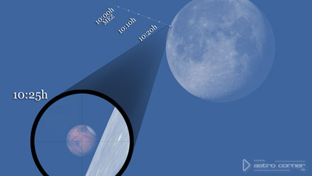 Der noch fast volle abnehmende Mond erscheint 31 Bogenminuten groß und zu 89,4% beleuchtet. Er benötigt etwa 22 Sekunden, um den rund 13 Bogensekunden groß erscheinenden zu 96% beleuchteten Marsglobus komplett zu überdecken.
