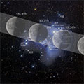 Der Überdeckungspfad verläuft zentral durch den Sternhaufen. Hier werden unter anderem die hellen Mitglieder Celaeno, Elektra, Maja und Alkyone bedeckt. In Deutschland werden wohl nur die Austritte der beiden letztgenannten Sterne am dunklen Mondrand zu beobachten sein. |