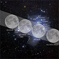 Der Überdeckungspfad verläuft durch zentrale Bereiche des Sternhaufens. Hier werden unter anderem die hellen Mitglieder Elektra, Merope, Alkyone, Plejone und Atlas von der Mondscheibe überquert. Die Verfinsterung der jeweiligen Sterne erfolgt am hellen Mondrand, der Austritt demzufolge an der dunklen Seite. Allerdings wird der Mond zu mehr als 99% beleuchtet sein und der von der Erde aus sichtbare dunkle Anteil der Mondoberfläche dementsprechend gering ausfallen. |