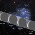 Der Überdeckungspfad verläuft durch den südlichen Bereich des Sternhaufens. Hier werden Merope, Alkyone, Atlas und Plejone von der Mondscheibe verdeckt. Die Verfinsterung der jeweiligen Sterne erfolgt am hellen Mondrand, der Austritt demzufolge an der dunklen Seite. |