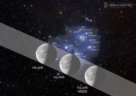 Zwischen 5.15 Uhr und 6.15 Uhr werden die helleren Sterne 26, 27 (Atlas) und 28 Tau (Plejone) bedeckt. Das Wiederauftauchen am dunklen Mondrand erfolgt bereits am hellen Tageshimmel und kann daher in Mitteleuropa nicht mehr beobachtet werden.
