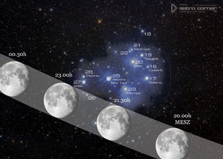 Am Abend des 19. Oktober 2024 überstreift der noch fast volle Mond die Plejaden. Im deutschsprachigen Raum kann das Ereignis in seiner vollen Länge beobachtet werden. Der Mond geht gegen 19.30h MESZ am ONO-Horizont auf. Zum Ende der Bedeckung um Mitternacht wird er eine Höhe von fast 45 Grad über dem OSO-Horizont erreicht haben.