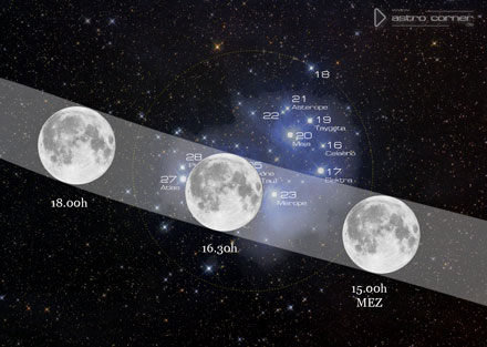 Am frühen Abend des 6. November 2025 überstreift der fast volle abnehmende Mond zwischen 15.00 Uhr und 18.00 Uhr Mitteleuropäischer Zeit (MEZ) den offenen Sternhaufen M45 (Plejaden).