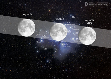 Im deutschsprachigen Raum kann die gesamte Passage unseres kosmischen Begleiters vor dem Siebengestirn in seiner vollen Länge beobachtet werden. Der Mond nähert sich dem offenen Sternhaufen in der Nacht.
