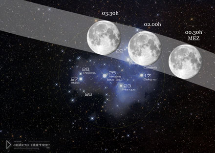 | Plejaden-Bedeckung am 28. Oktober 2026 - die Angaben beziehen sich auf den Ort mit den geographischen Koordinaten 50° ö.L. und 10° n.B. und können für andere Orte leicht abweichen |
