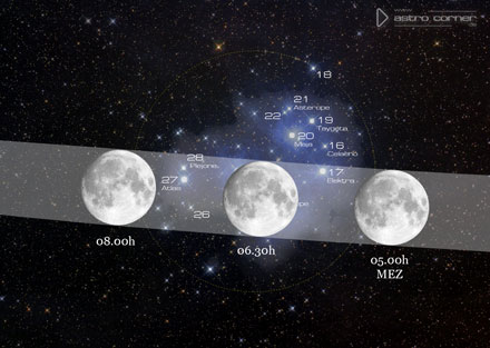 | Plejaden-Bedeckung am 12. Dezember 2027 - die Angaben beziehen sich auf den Ort mit den geographischen Koordinaten 50° ö.L. und 10° n.B. und können für andere Orte leicht abweichen |