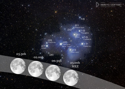 | Plejaden-Bedeckung am 3. November 2028 - die Angaben beziehen sich auf den Ort mit den geographischen Koordinaten 50° ö.L. und 10° n.B. und können für andere Orte leicht abweichen |