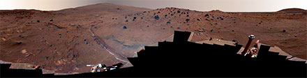 Nach dem erfolgreichen Abstieg und einer langen Winterpause befindet sich sich der in seiner Bewegungsfreiheit eingeschränkte und mittlerweile energieschwache Rover nun schon viele Monate in der Nähe einer flachen geologisch interessanten Felsstruktur vulkanischen Ursprungs, die auf den Namen Home Plate getauft wurde.