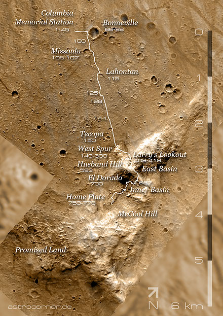 So gelang es Spirit am 17. April 2006 (Sol 813) ein Bild anzufertigen, das den Blick hinauf zu dem zuvor erklommenen Husband Berg mit der Düne El Dorado zeigt. Bis zu diesem Standort hatte Spirit im Verlauf der Mission insgesamt 6.876 Meter über die Marsoberfläche zurückgelegt.